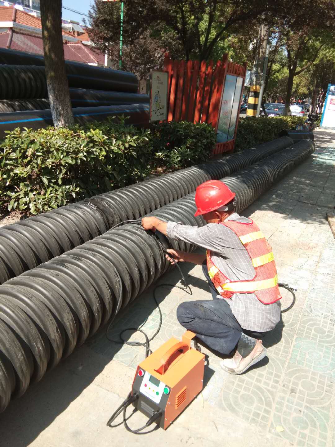 圖為:烈日下,管道安裝工在新區(qū)南苑路進(jìn)行污水管道焊接。