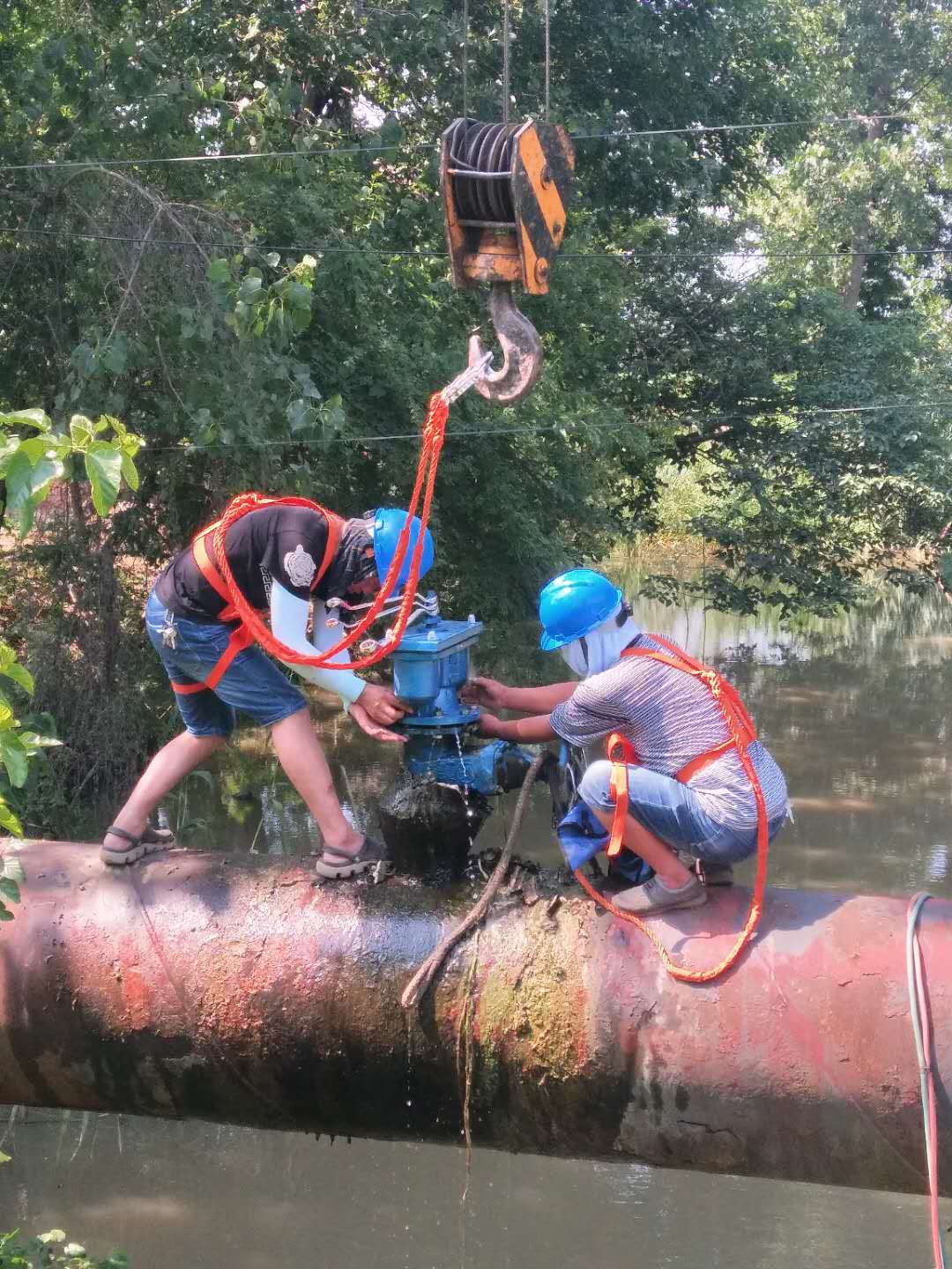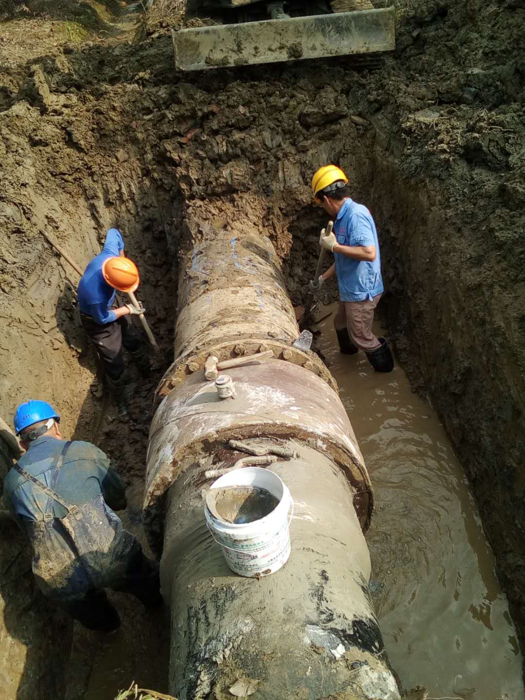 圖為:管道維修工人頭頂烈日,并搶時(shí)爭速,在泥水中搶修237省道通揚(yáng)運(yùn)河段DN800主管網(wǎng)。