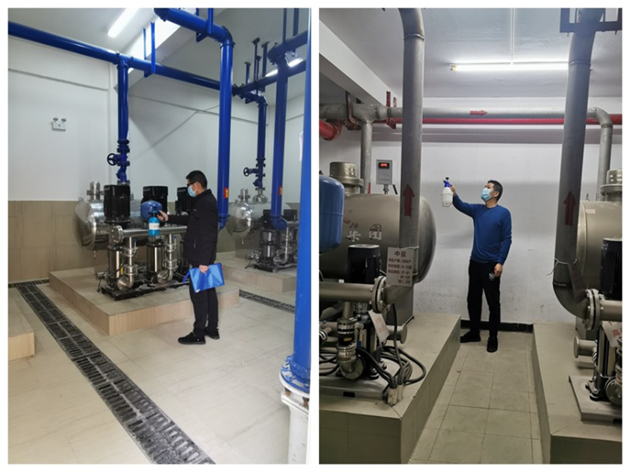 在對各小區(qū)二次供水泵房進行巡察巡視的同時,也不忘對各泵房進行清理和消毒工作,確保在疫情期間高層用戶的用水保障和用水質(zhì)量,以及二次供水設(shè)備的高效、穩(wěn)定的運行。