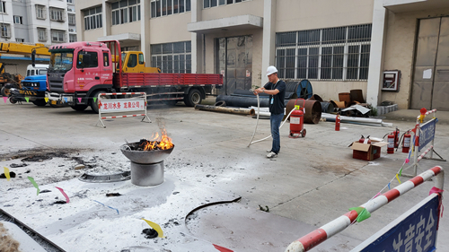 安全主任夏陽(yáng)華現(xiàn)場(chǎng)講解防火、消防知識(shí),并進(jìn)行示范。龍泉公司職工開(kāi)始進(jìn)行消防演練。演練人站在預(yù)備點(diǎn)發(fā)現(xiàn)著火;跑到消防箱提滅火器;確認(rèn)滅火器合格可用;向目標(biāo)火源方向跑去邊搖動(dòng)滅火器;到目標(biāo)火源后繞到火源風(fēng)向上方,拔下滅火器插銷,將滅火器管口對(duì)準(zhǔn)火源噴射把火撲滅。 最后,將演練火種全部熄滅,清除現(xiàn)場(chǎng)所有雜物,恢復(fù)正常狀態(tài)。