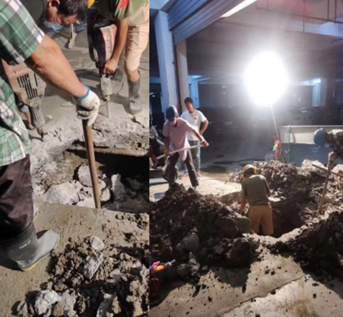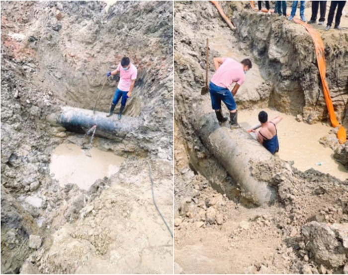 8月11日上午8時許,公司得到真武楊莊京滬高速下一處DN800球管漏水消息后,迅速組織人員趕往現(xiàn)場。經(jīng)現(xiàn)場勘查,因挖機施工失誤造成管身破出一個20公分大的洞。為了防止停水造成大范圍群眾和重點單位部門用水受到影響,經(jīng)驗豐富的搶修人員對此迅速做出搶修方案:關(guān)閉泵站增壓泵,低壓供水,用其木棍堵住部分余水,便于人員入坑打抱箍。經(jīng)過4個多小時艱苦奮斗,于下午13點30分,供水恢復(fù)正常。