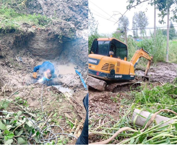 8月12日上午8時許,公司接到群眾電話稱,江都區(qū)丁伙鎮(zhèn)紅廟渠南路魚塘附近,有水管出現(xiàn)爆漏。龍泉公司項目部夏陽華經(jīng)理帶領(lǐng)搶修人員立即到達現(xiàn)場核查,經(jīng)查明是DN500鋼管老化裂出口子。事故點在小路半坡大樹下,靠近魚塘且土質(zhì)松軟濕滑,機械施工難度較大,修復(fù)時間也較長。歷經(jīng)9個小時才將漏點修復(fù)。