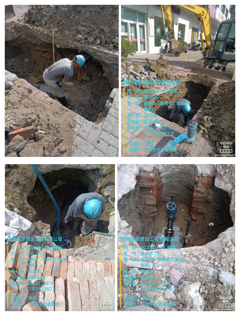 今年三伏天,高溫和暴曬持續不斷,天氣異常炎熱。7月13日,新時代廣場高層供水管道破裂。龍泉公司接到客服部工單后,維修部與高層供水運管部對新時代廣場周圍進行漏點排查,在華夏銀行門口發現高層管道破裂,導致高層用戶水壓偏低。隨后工作人員立即調來人員和機械進行緊急搶修。定位、圍擋、開挖、排水、定方案,所有工序緊鑼密鼓、有條不紊。經過通力協作,下午時間搶修完畢,恢復正常供水。