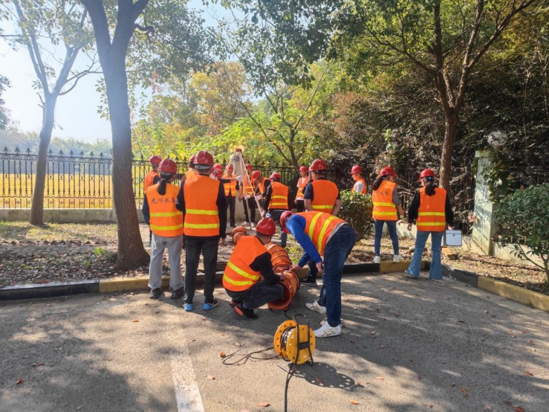 演練內(nèi)容為模擬有限空間事故發(fā)生在丁伙泵站進(jìn)水閥門井現(xiàn)場(chǎng),由于人員違章操作,在未經(jīng)審批的情況下,下井作業(yè)暈倒,情況十分危急,指揮組命令立即啟動(dòng)有限空間應(yīng)急搶修預(yù)案,各小組人員立即趕往現(xiàn)場(chǎng)進(jìn)行救援。